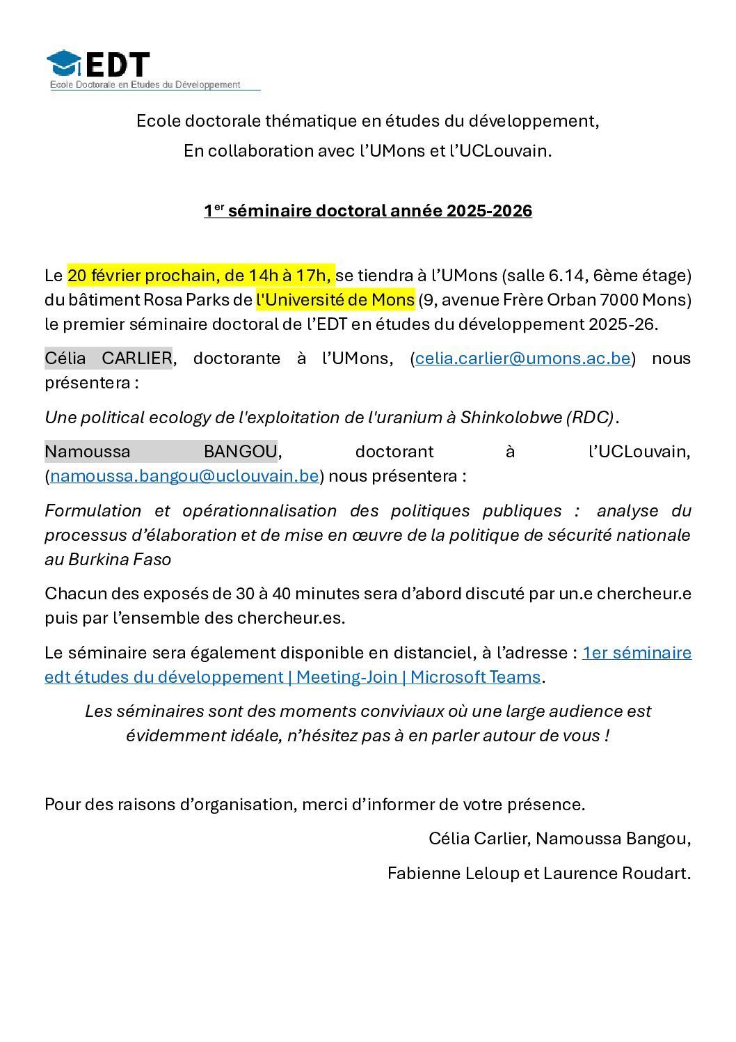 L’École doctorale thématique en études du développement organise son premier séminaire de l’année académique 2025‑2026, en collaboration avec l’UMons et l’UCLouvain.